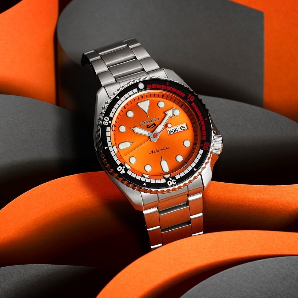 A vibrant 5 Sports limited edition 55th Anniversary ref. SBSA215 featuring a bold orange dial inspired by Seiko’s Customize Campaign. Powered by the reliable 4R36 automatic movement, this model combines sporty design with collector appeal, and the JDM SBSA215 version includes the desirable bilingual English/Kanji day wheel for an authentic Japanese touch.